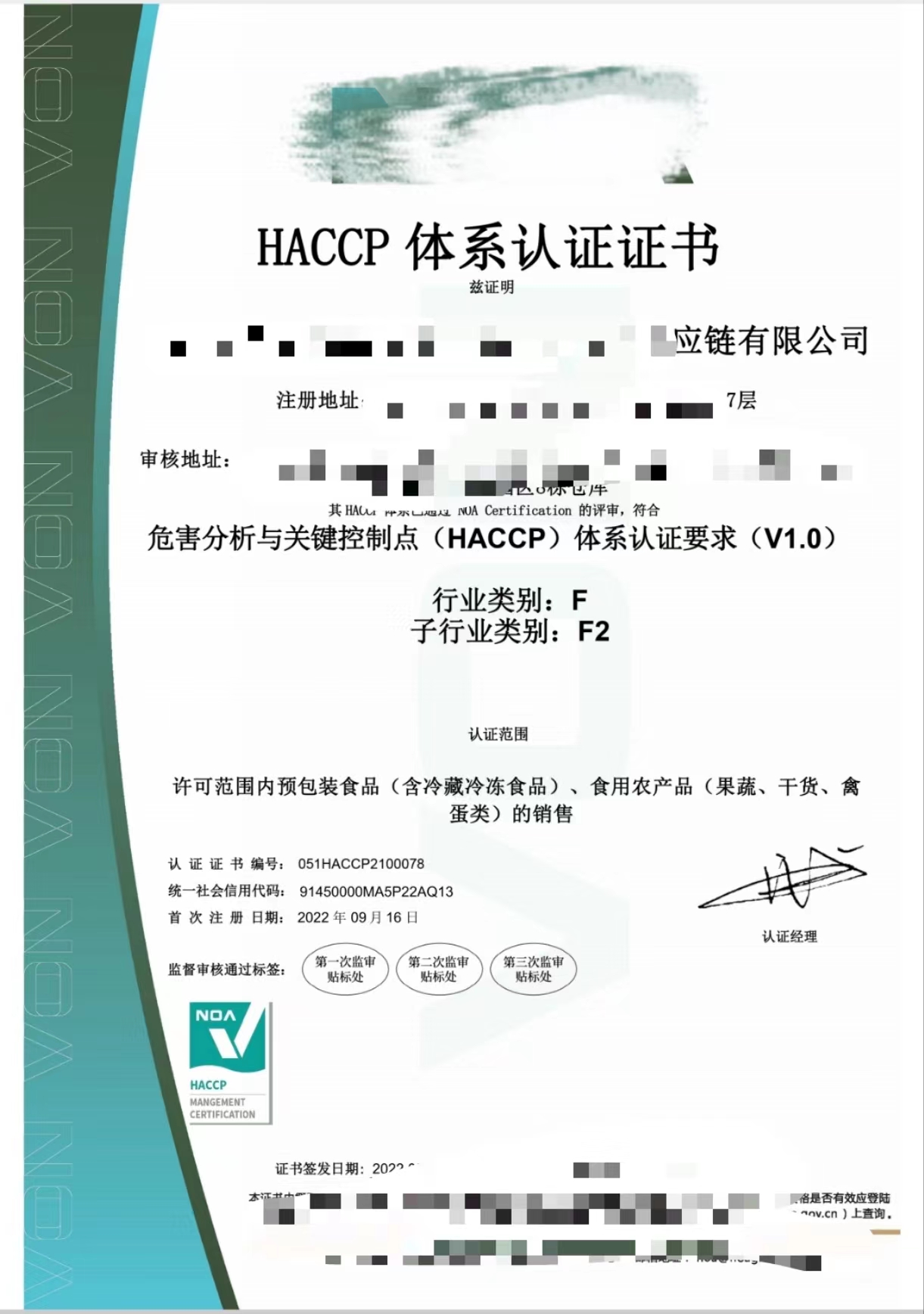 ISO22000食品安全管理体系认证证书